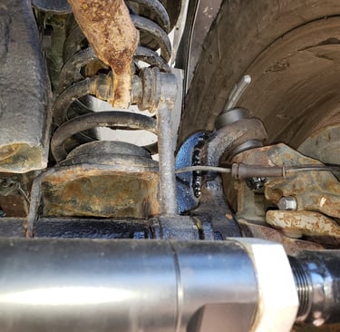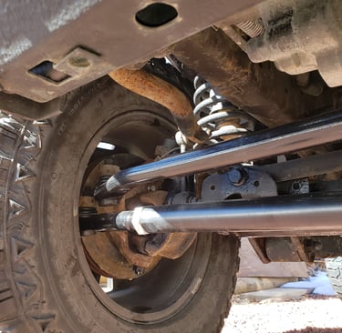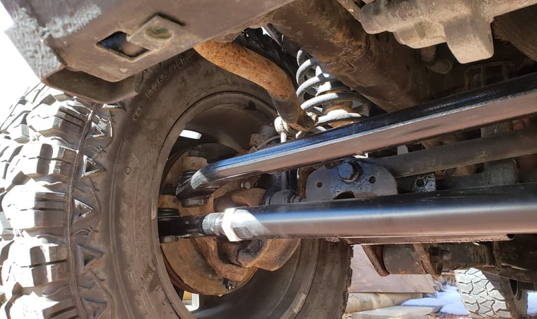 After purchasing the jeep, I noticed the steer was not precise and the jeep tended to wander. As a result of this issue, I did some reading and found there were a variety of possible causes several things to consider when working on the front suspension. I decided to gusset the Cs and truss the front axle since work needed to be done on the front end and decided the work was probably beyond my ability (I am NOT a good welder) and to take it to a local 4x4 shop for troubleshooting. The shop suggested to sleeve the axle instead of adding a truss. I had had an alignment check done previously and found the axle's camber was just a little out-of-specification and there was a possibility an axle sleeve would correct the camber. That was a gamble regarding whether it would fix the camber problem but I figured that the sleeve would make the axle a little stronger so there wasnt much of a risk since it was less expensive to sleeve the axle and since I wasnt planning to do difficult trails, an axle truss might not be needed. Also I had read that it might be a good idea to do the lift before the axle truss as otherwise there could be interference. I'm not sure that is right; however, I also didnt see much of a downside. While installing the sleeve, replacing the ball joints, and installing the C gussets, the work, the shop found noticed several issues that needed to be addressed. Initially the tie rods were worn and could not be adjusted due to rust so I decided to replace both the tie rods and the drag link with Teraflex HD hardware. The shop also found a significant amount of rust inside the axle and that 2 of the 4 hub bolts on the passenger side where almost rusted half way through and we decided to replace all the hub bolts. After the purchase, I found that rust is an on-going issue with jeep and each should be looked at closely prior to purchase. In my jeep's case, the frame was undercoated with a thick undercoating which since applied has started to crack. My understanding is that when that happens, water enters through the cracks, gets trapped an then causes rust. I have since been removing as much of the cracked undercoating as possible. From what I can tell, the frame hasnt been damaged significantly; however, it is something I'm watching closely. There does not appear to be significant rust elsewhere but I have a suspicion the jeep sat for a period of time in water up to the bottom of the cab or was exposed to salted roads (it was from Nebraska) for a while.